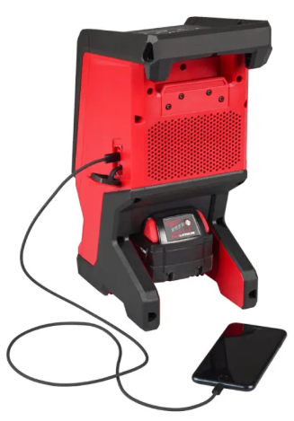 Akumulátorový přenosný reproduktor na staveniště Milwaukee M18 SPEJSG2nabíjecí slot USB-C vhodný pro všechna elektronická zařízení s USB portem (mobil, tablet, MP3 přehrávač apod.). Připojení přes Bluetooth 5.0 (dosah až 60 metrů) pro přehrávání hudby