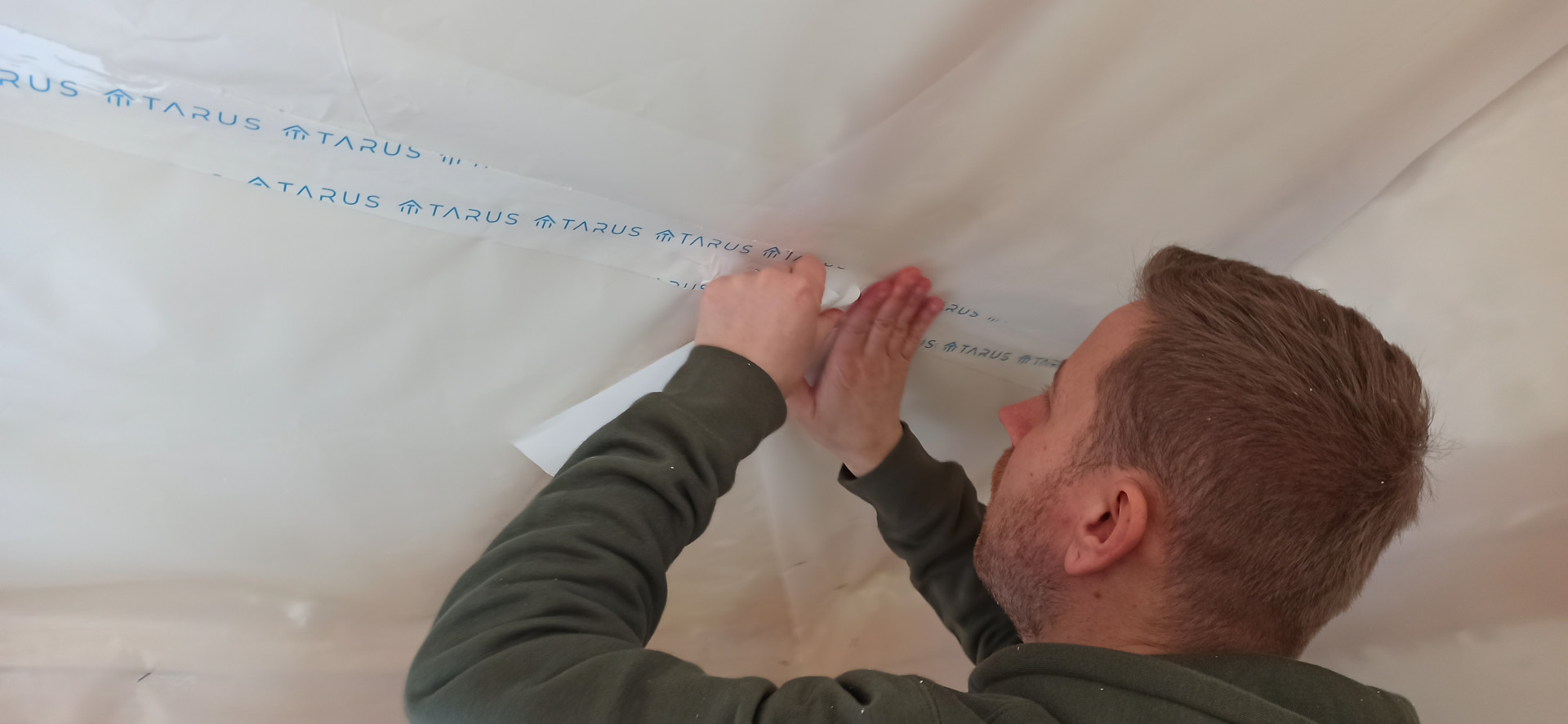 Při montáži parozábrany TARUS NANO 120 na vodorovný nebo šikmý strop je nutné použít oboustranně lepící pásku TARUS TAPE EXTRA STRONG a pomocí TARUS lepidla na parozábrany ji nalepit na štítové stěny.