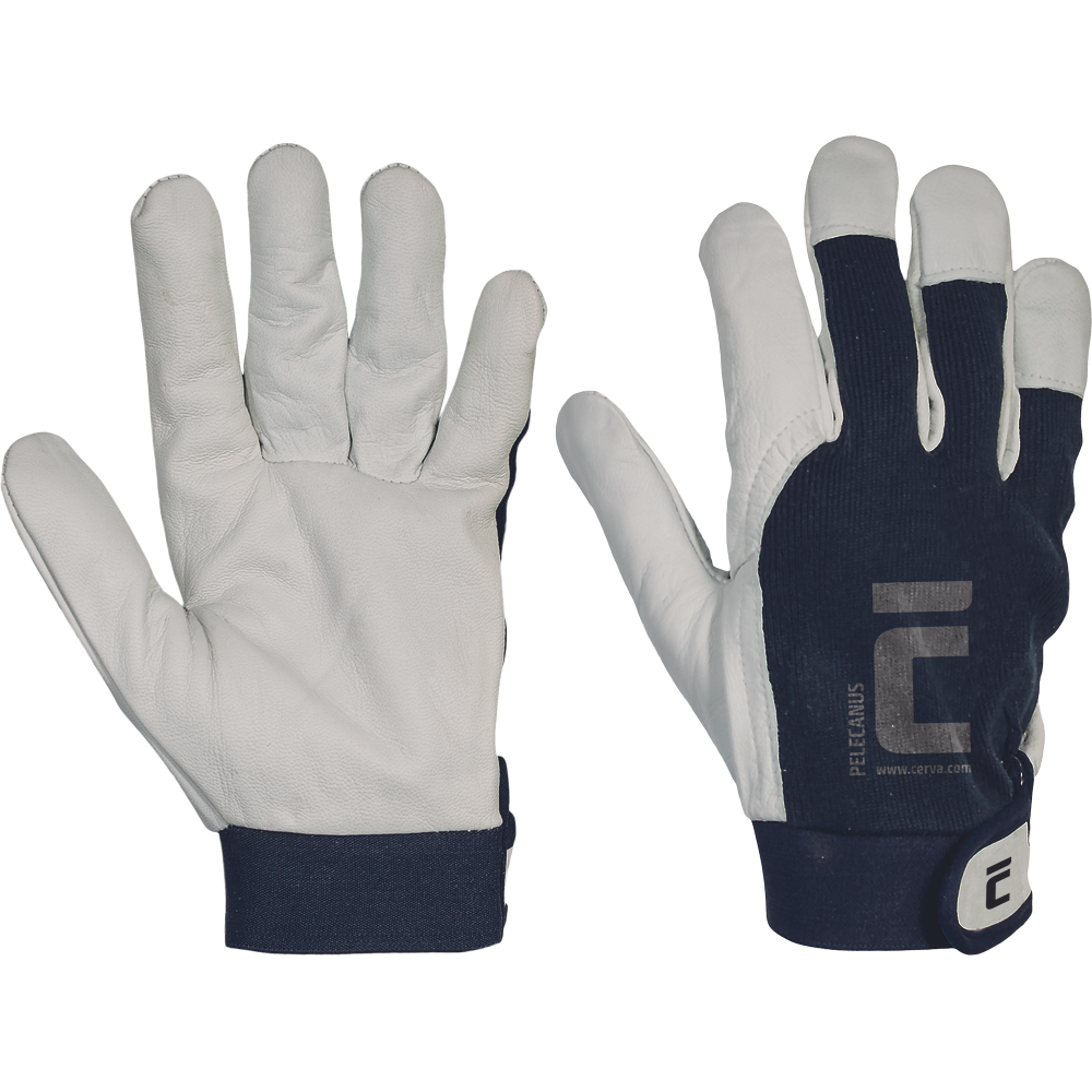 Kombinované šité rukavice CERVA PELECANUS jsou vyrobeny z jemné kozinky v dlani a bavlněného úpletu na hřbetu rukavic. Rukavice mají kůží překryté špičky prstů a pružnou manžetu na suchý zip. Rukavice jsou určeny k širokému spektru prací na ochranu proti mechanickým rizikům.